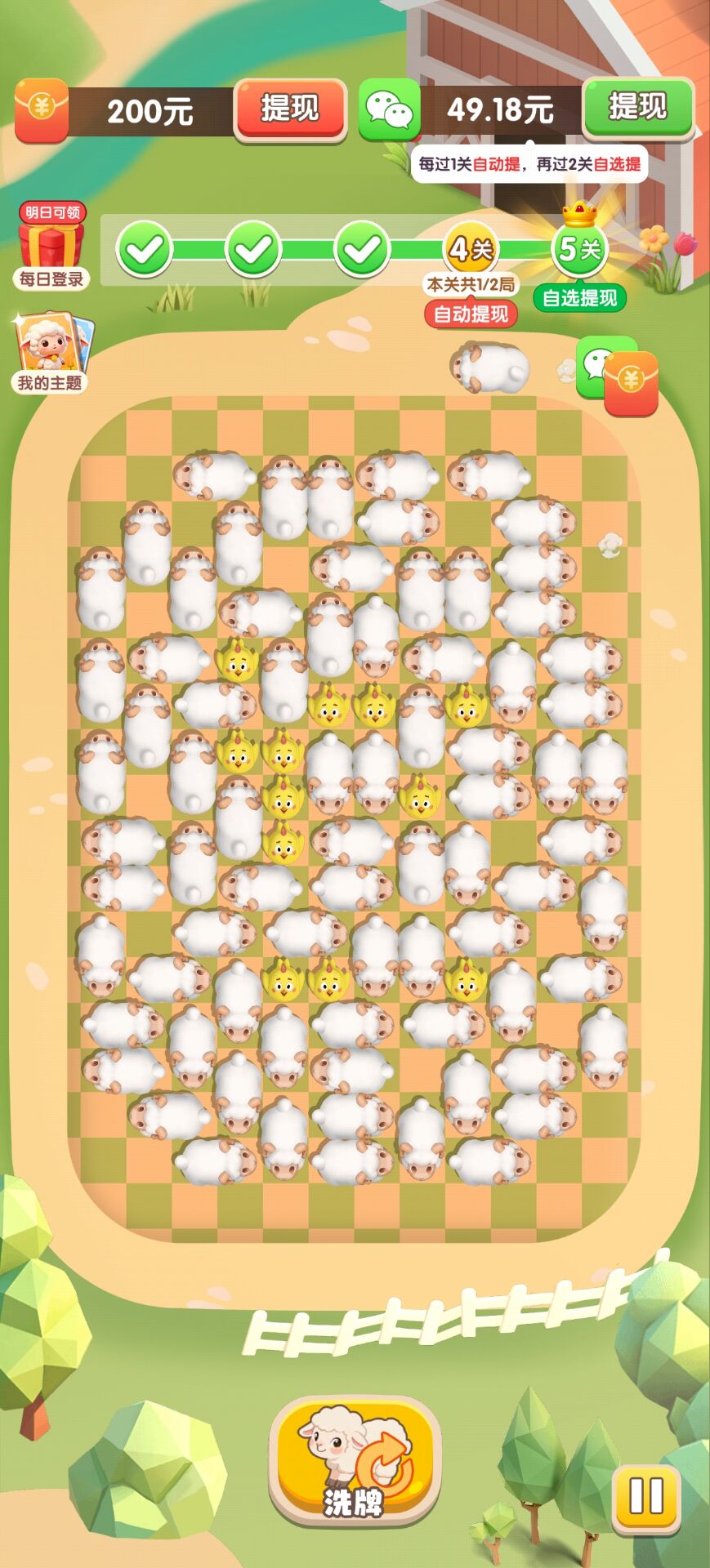 1、闯关领红包:拖拽/点击小羊按规则归位,通关得基础红包;关卡越往后,红包额度越高。