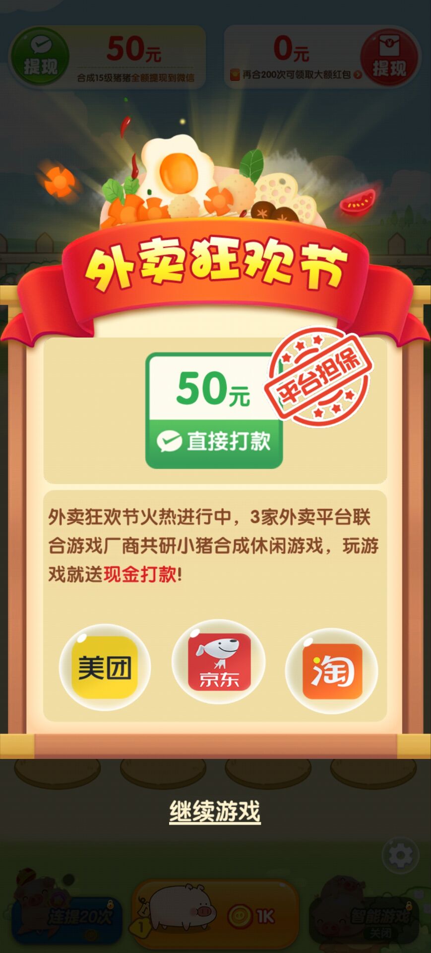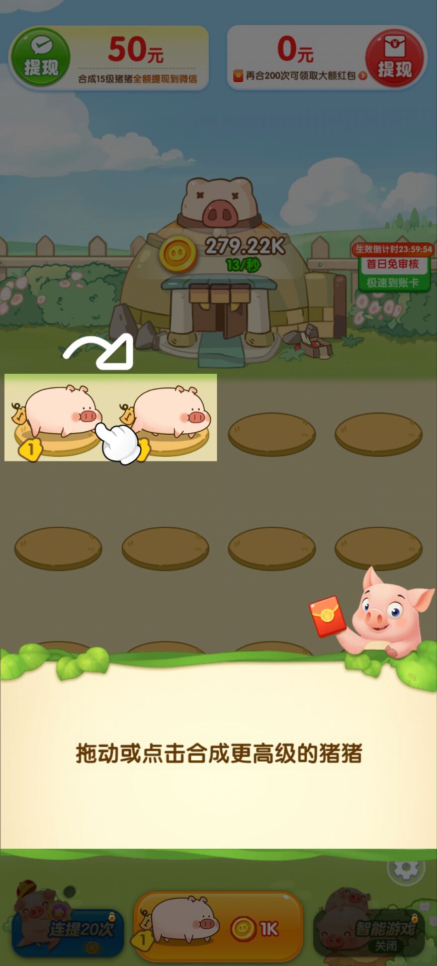 1、合成领红包:将相同等级小猪拖拽合成更高等级,等级越高,红包/金币收益越丰厚;开启“智能合成”可自动合并,解放双手。